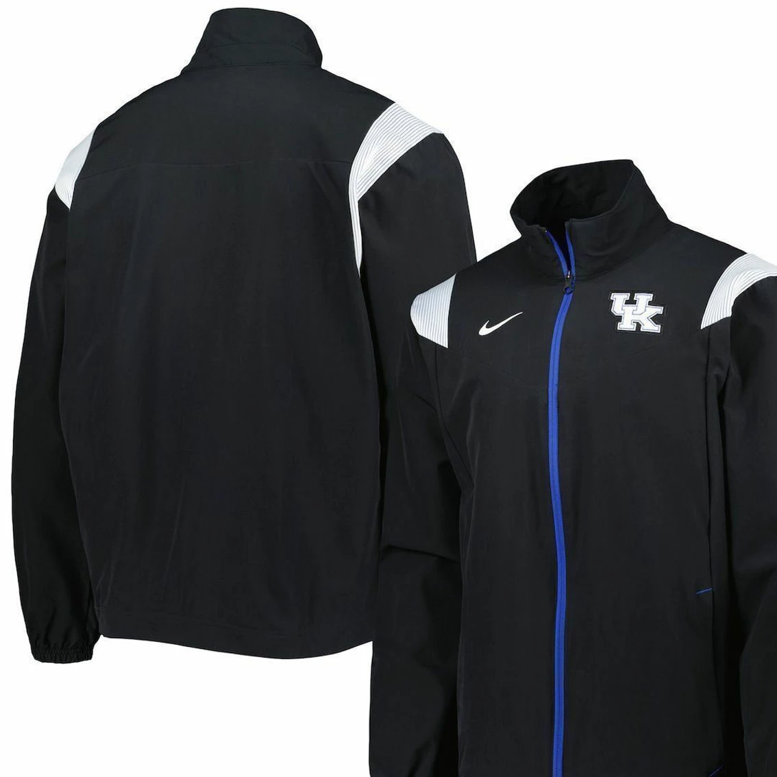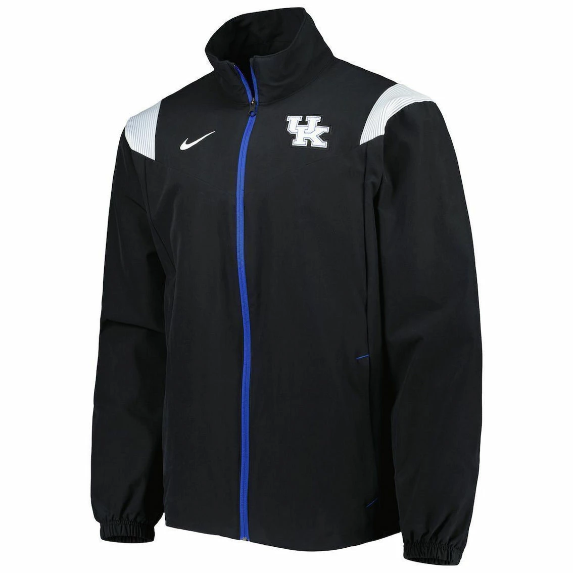 - When you’re ready to cheer on the Kentucky Wildcats, but there’s a bit of a chill in the air, layer up with this Woven full-zip jacket from Nike. The bold Kentucky Wildcats logo on the left chest and the contrasting stripes on the shoulders put your fandom at the forefront. The Olympic collar helps protect your neck from the cold and the elements.