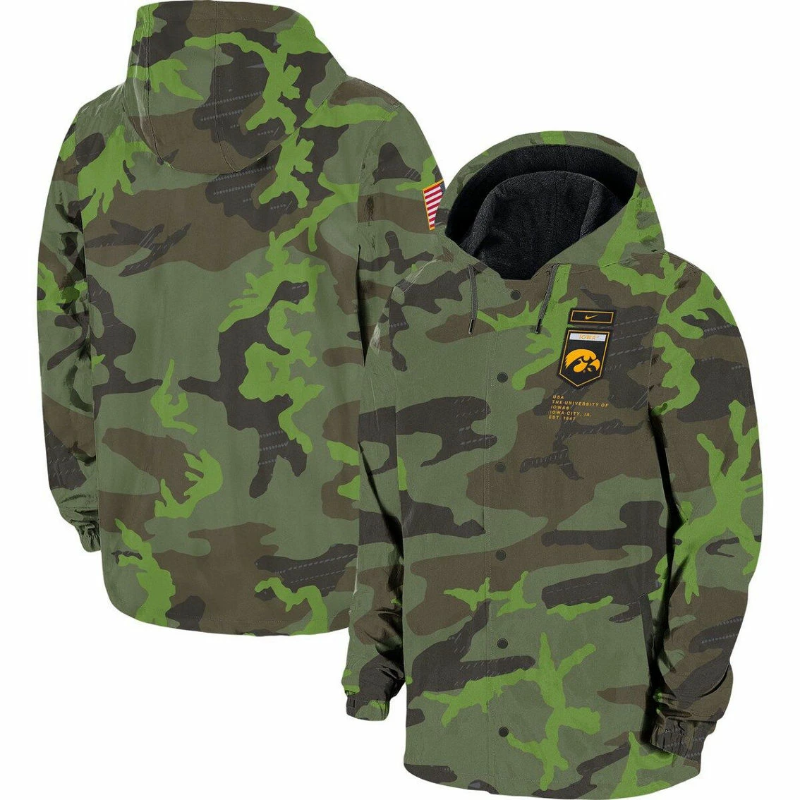 - Stay warm in armed forces style with this Iowa Hawkeyes full-snap hoodie jacket from Nike. It features military-inspired Iowa Hawkeyes graphics on the front and an American flag on the right sleeve. The roomy hood and pockets also provide additional warmth when temperatures drop.