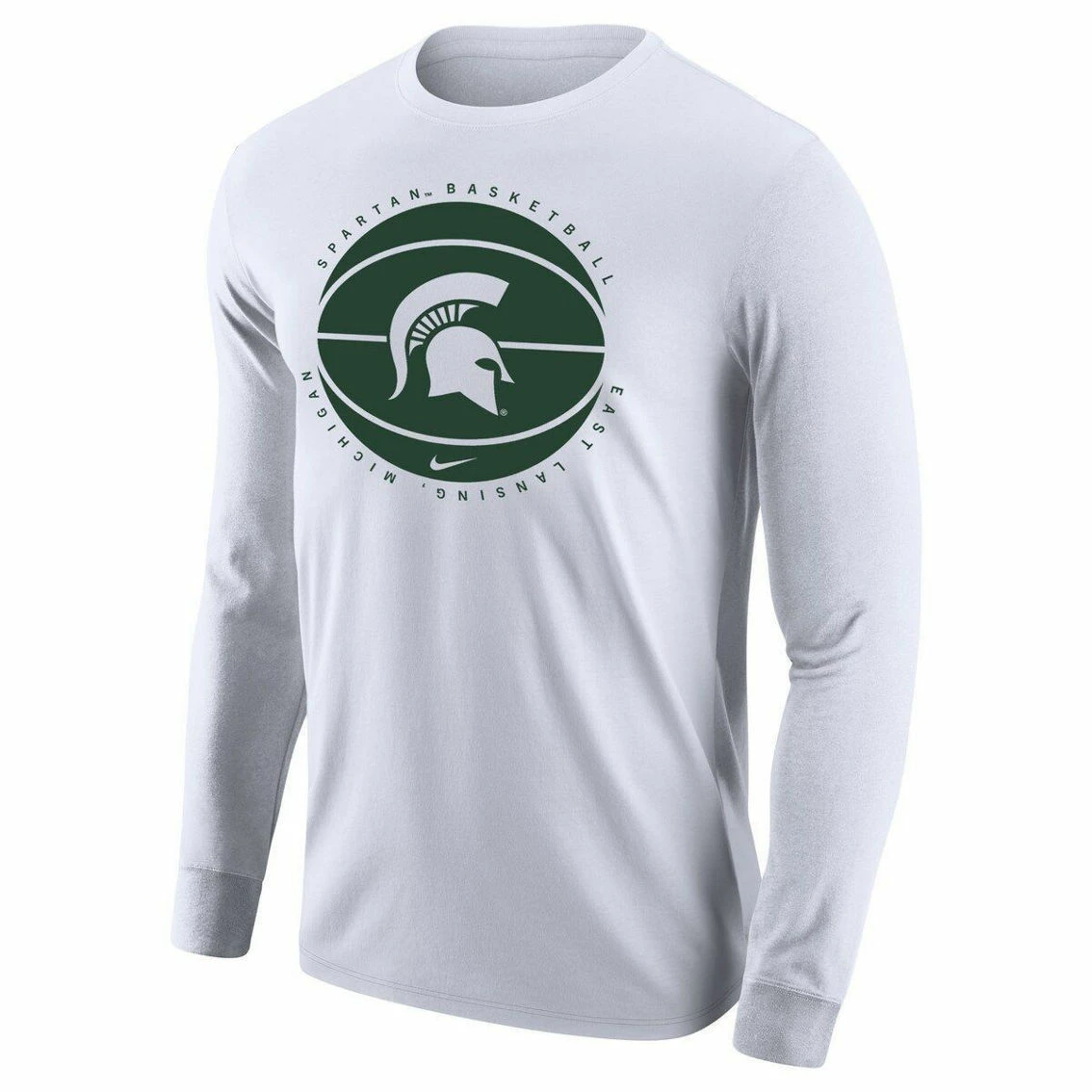 - When the Michigan State Spartans hit the hardwood, be ready to cheer them on with this T-shirt from Nike. It features the team’s logo on top of an exciting basketball design, as well as the city that they call home written below it. When you throw on this long sleeve tee and feel that soft cotton fabric, you’ll know that you have your new go-to piece of Michigan State Spartans gear.