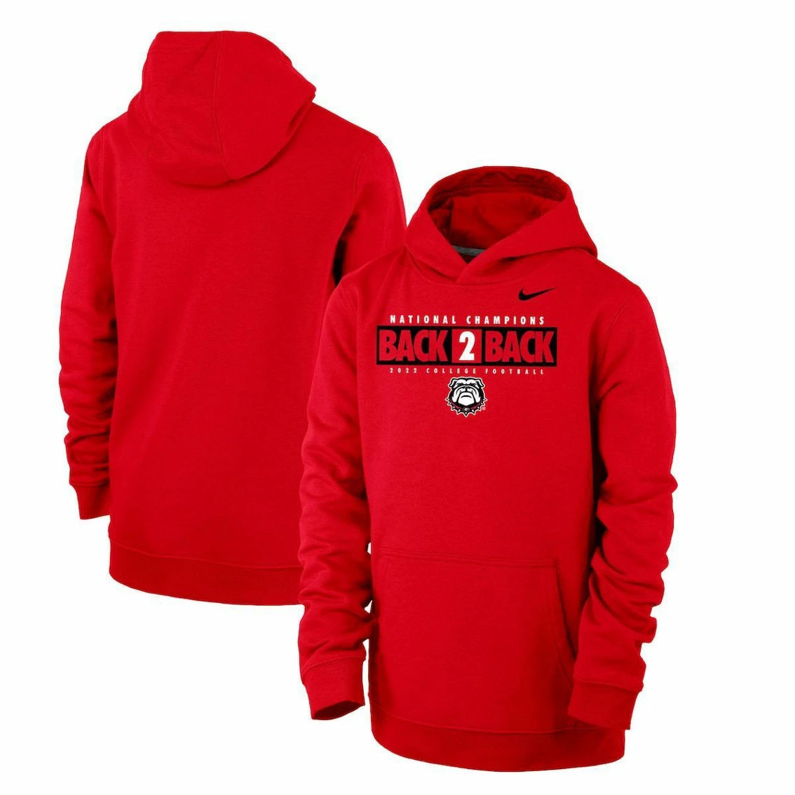 - After an exhilarating season, the Georgia Bulldogs are now the Back-To-Back College Football Playoff National Champions! They pulled off all the right plays on both sides of the ball to claim their spot as the best in the country. Have your young fan show off their excitement for the Georgia Bulldogs by grabbing this Pullover Hoodie from Nike. Special commemorative graphics will help your kiddo celebrate this National Championship and incredible victory for the Georgia Bulldogs.